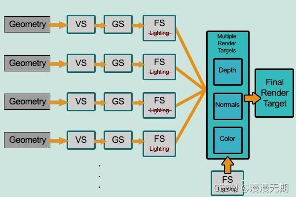前向渲染是现在最基础,也是最多引擎使用的标准。前向渲染的流程是给定一个几何体,引擎对其进行从顶点到像素着色器的一系列计算,然后输出到最终的图像缓冲区。场景中有多个几何体时,引擎就是对其挨个进行渲染,完成一个再继续下一个。